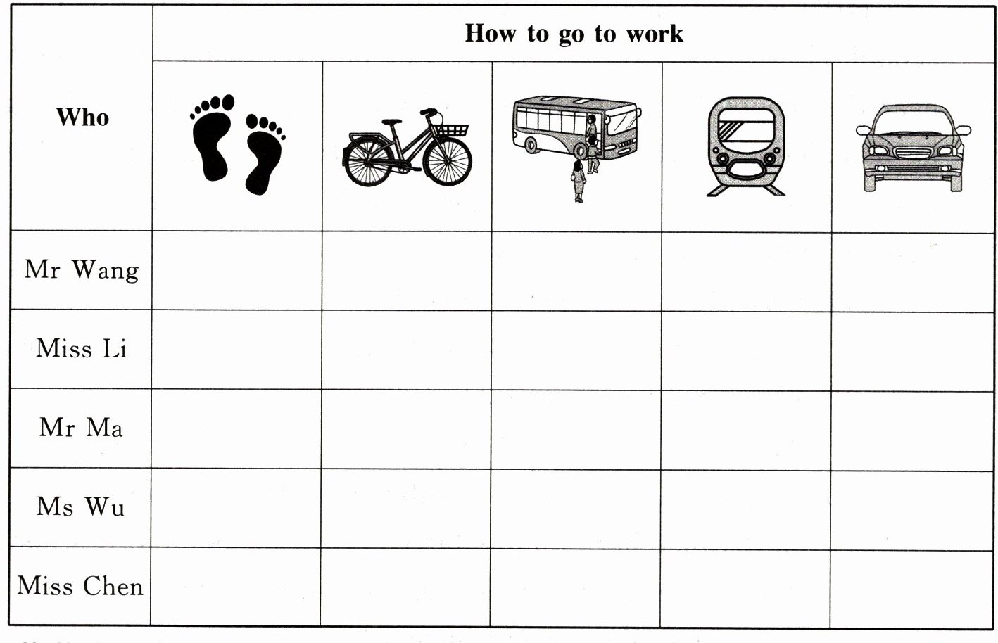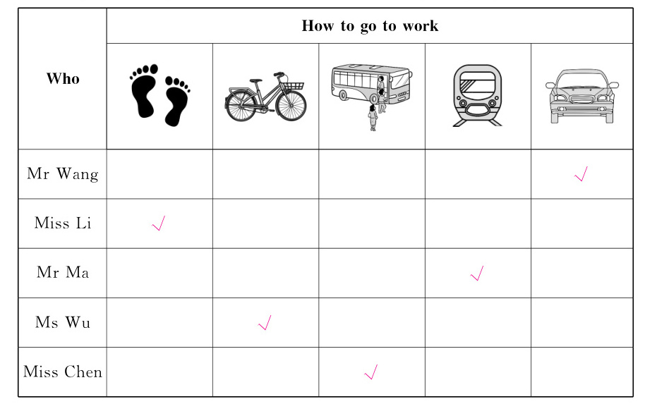 二、乐乐报名参加了社区“文明出行”宣传活动,他先了解了居民的上班出行方式。听句子,选择每个人常用的出行方式,画“√”。