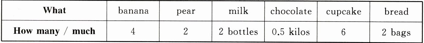 | How many / much | 4 | 2 | 2 bottles | 0.5 kilos | 6 | 2 bags |