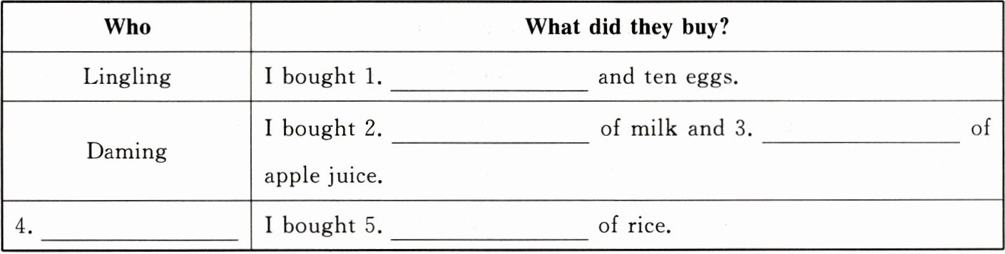 三、玲玲今早和家人去购物了。听短文,补全表格。(每空不超过 2 个单词)