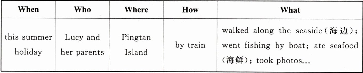 五、今年暑假 Lucy 和家人去了福建平潭岛旅行。假如你是 Lucy,请根据表格内容,以“My trip”为题,写一篇游记。
