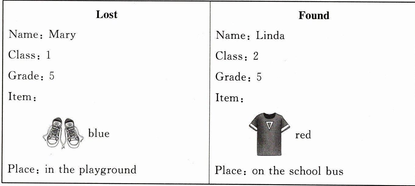1. Mary from Class One ,Grade Five lost a pair of blue shoes .She lost them in the playground.If(如果)you find them,please go to her classroom.
