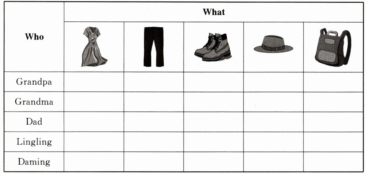 四、玲玲的妈妈在这家商场为家人购买了一些物品。听对话,找出她为家人购买的对应物品,画“√”。