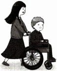 ( B )1. The boy is blind. A girl helps him.