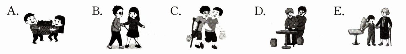 三、刘老师让同学们在生活中寻找助人为乐的事迹,并分享给大家。请给下列句子选择对应的图片。
