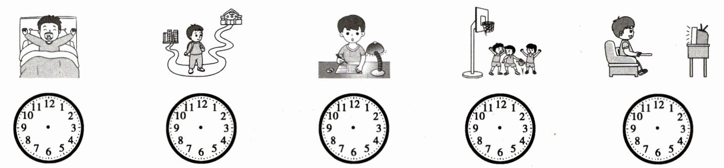 二、天天的日常生活很有规律,让我们来看看他上学日的一天是怎么度过的。请给下列图片选择对应的描述,并在表盘中画出对应的时间。