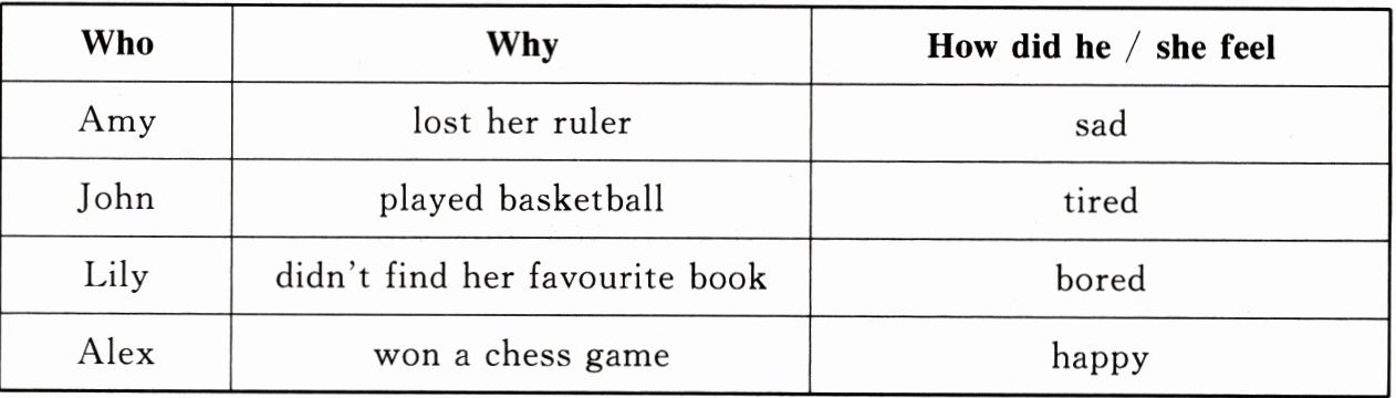 My friends and I had different feelings last Friday.I lost my ruler.So I felt sad.My friend John played basketball.He felt tired.Lily didn't find her favourite book.So she felt bored.Alex won a chess game.He felt very happy.