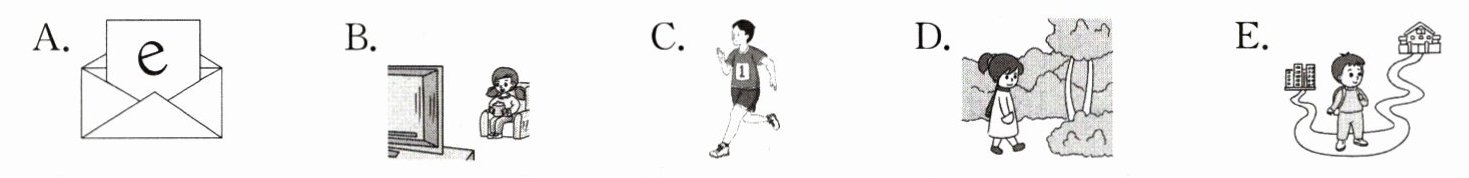 五、Bella 和朋友分享了各自最近的活动。请给下列句子选择对应的图片。