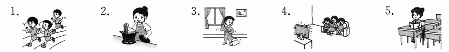 一、朋友们相约到 Lucy 家里玩,Lucy 正在给他们看照片。听句子或对话,判断下列图片与你所听到的内容是否相符,相符的画“√”,不相符的画“×”。