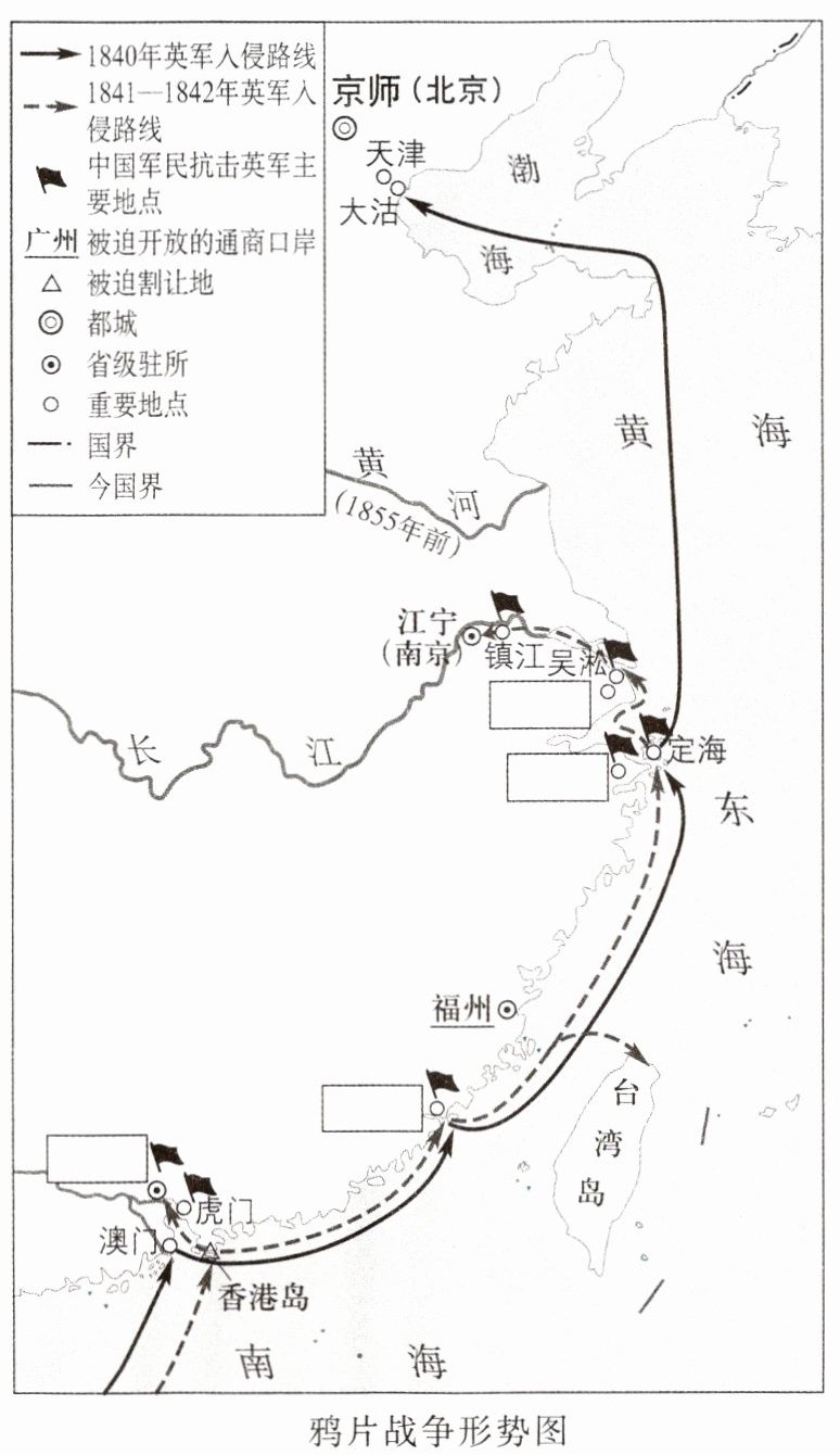 3 在下图方框内填入鸦片战争后被迫开放的通商口岸。