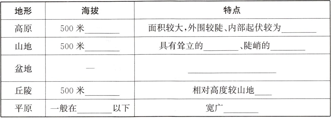 (1) 分类:陆地表面的地形类型有山地、丘陵、高原、平原和盆地五种。