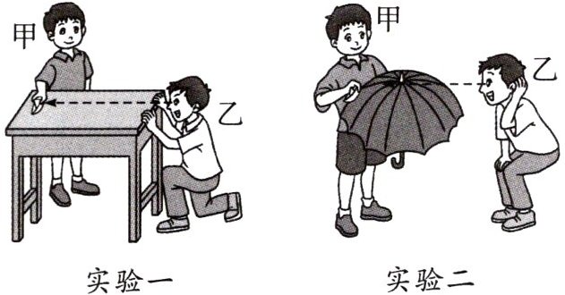 甲、乙两位同学利用小纸船在桌面和伞面上的运动现象,来模拟大海上轮船驶向远处的过程,从而探究地球的形状。甲为演示者,乙为观察者。