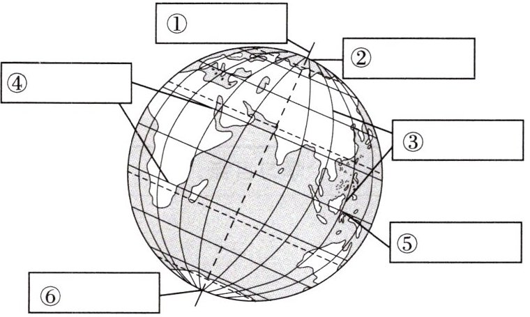 4. 读地球仪示意图,在地球仪相应位置的方框里填注地轴、北极、南极、赤道、经线、纬线。