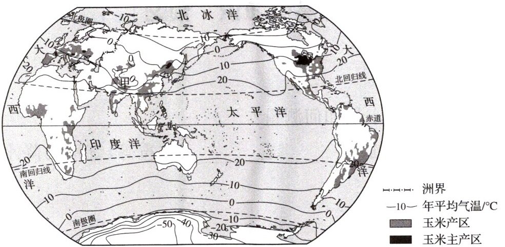 11. 玉米是重要的粮食作物。下图为世界年平均气温和玉米产区分布图。读图,完成下列各题。