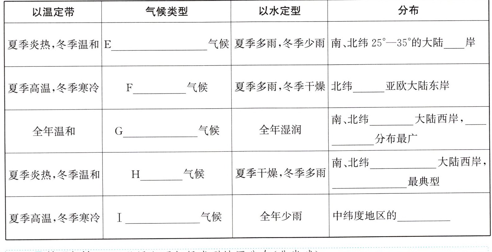 思考2:亚热带季风气候和湿润 东 温带季风 35°—55° 温带海洋性 40°—60° 欧洲西部 地中海 30°—40° 地中海沿岸 温带大陆性 大陆内部