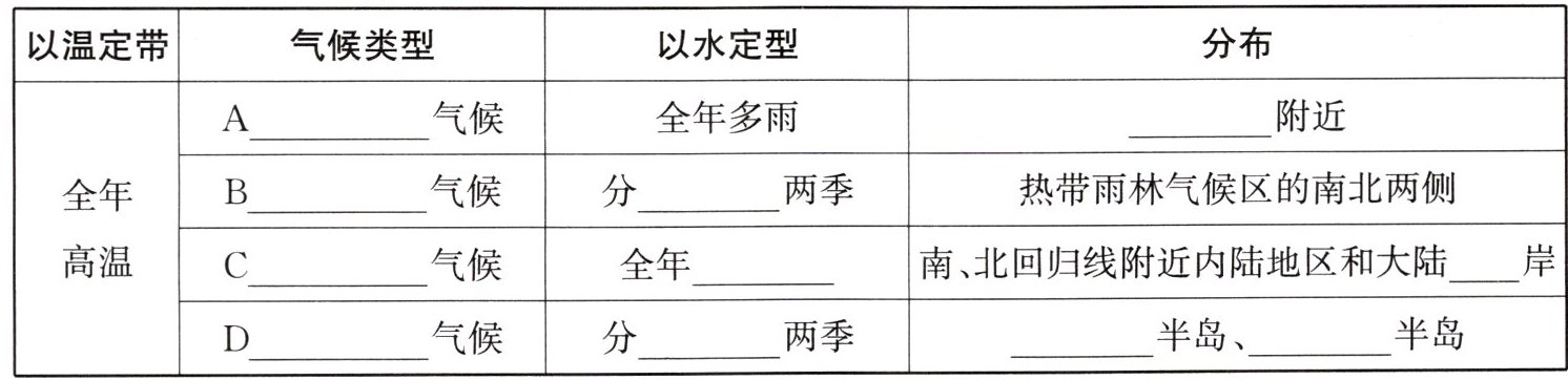 思考1:热带雨林 赤道 热带草原 干湿 热带沙漠 少雨 西 热带季风 旱雨 印度 中南