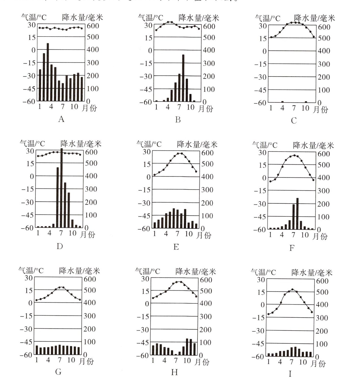 下面为世界部分气候类型的气温曲线与降水量柱状图。
