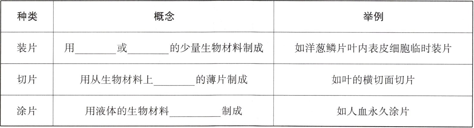 |装片|用____或____的少量生物材料制成|如洋葱鳞片叶内表皮细胞临时装片|