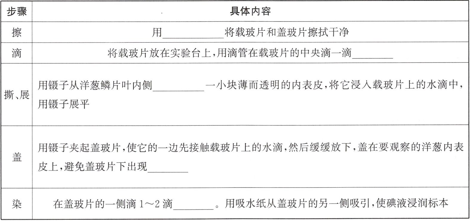 |盖|用镊子夹起盖玻片,使它的一边先接触载玻片上的水滴,然后缓缓放下,盖在要观察的洋葱内表皮上,避免盖玻片下出现____|