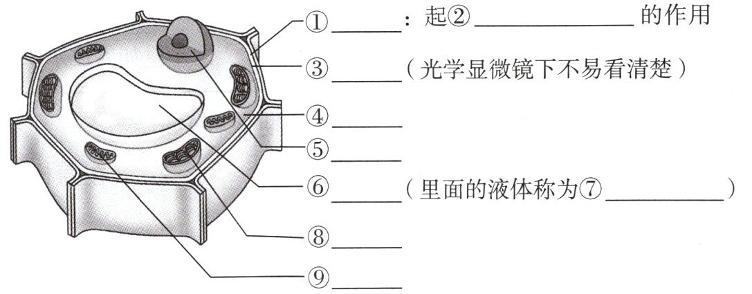 ①细胞壁 ②保护和支持细胞 ③细胞膜 ④细胞质 ⑤细胞核 ⑥液泡 ⑦细胞液 ⑧叶绿体 ⑨线粒体