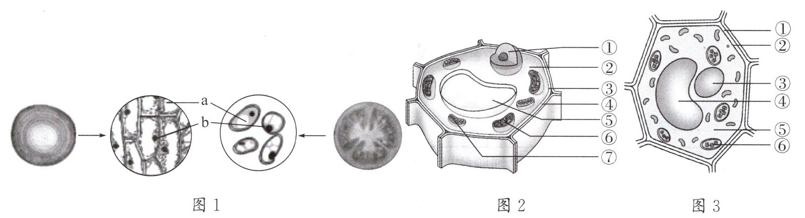 (3)图 2 是植物细胞结构示意图,做出此判断的依据是该细胞具有以下三种结构:细胞最外层的[ ]____;含有无机盐、糖类、色素等多种物质的[ ]____;在植物体绿色部分的细胞中,细胞质内还有[ ]____。