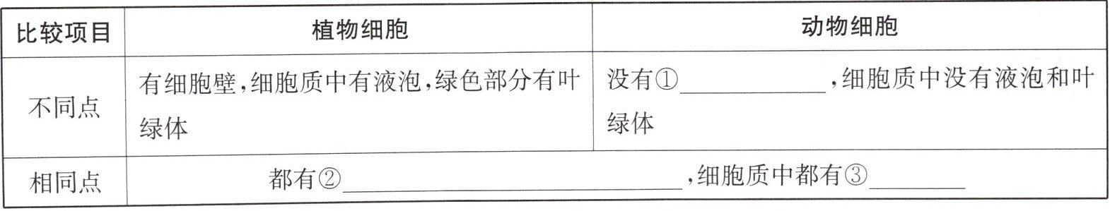 |不同点|有细胞壁,细胞质中有液泡,绿色部分有叶绿体|没有①____,细胞质中没有液泡和叶绿体|