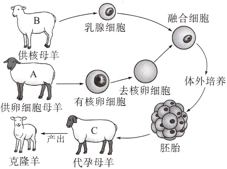 (2)现象:小羊多莉长得不像为它提供细胞质的______羊,也不像为它提供发育场所的______羊,反而与为它提供细胞核的______羊十分相像。
