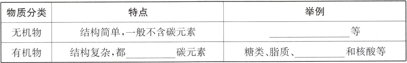 |有机物|结构复杂,都______碳元素|糖类、脂质、______和核酸等|