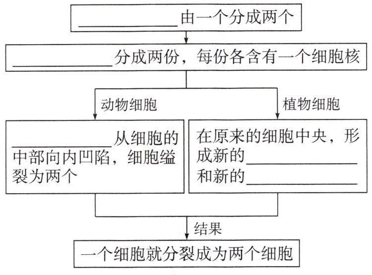 A[______由一个分成两个] --> B[______分成两份,每份各含有一个细胞核]