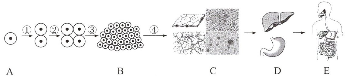 - (1)整个人体都是由A细胞发育而成的,A细胞是______,①②③过程是指细胞______,④过程是指______,在此过程中,细胞的形态、结构和功能发生了变化,其结果是细胞的______(填“数量”或“种类”)增多。
