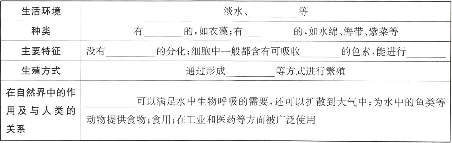|种类|有______的,如衣藻;有______的,如水绵、海带、紫菜等|
