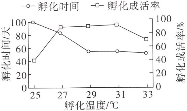13. 龟受精卵的孵化往往受环境温度的影响,为探究温度对某种龟受精卵孵化时间、孵化成活率的影响,研究人员将一定数量的该种龟的受精卵平均分成五组,分别置于不同的温度下孵化,结果如下图所示。请回答下列问题。