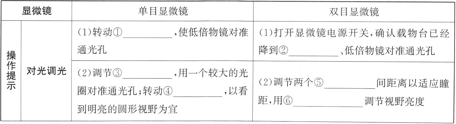 (2)调节两个⑤____间距离以适应瞳距,用⑥____调节视野亮度|