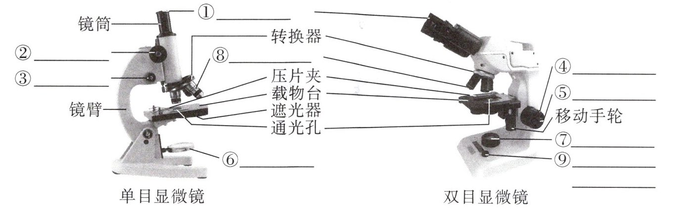 (3)把要观察的玻片标本放在载物台上,用压片夹固定,通过调整⑦____来移动玻片,将标本移至通光孔中心