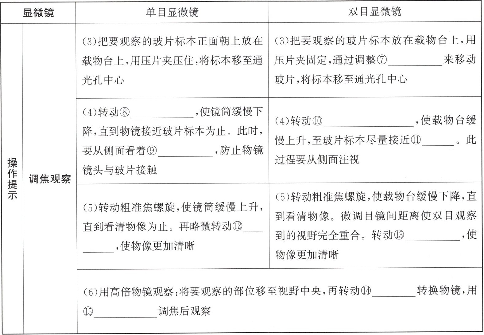 (6)用高倍物镜观察:将要观察的部位移至视野中央,再转动⑭____转换物镜,用⑮____调焦后观察|调焦观察