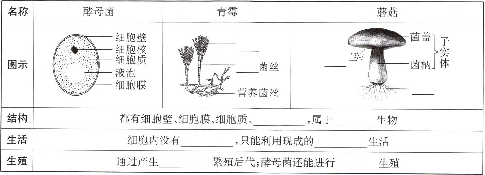 |结构|都有细胞壁、细胞膜、细胞质、______,属于______生物|