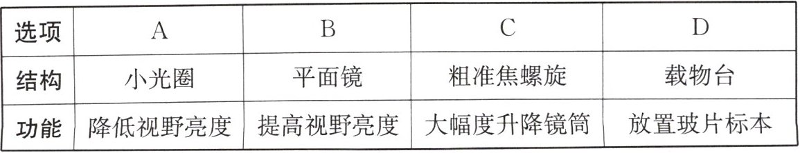 2. 显微镜是生物学学习和研究中常用的工具之一。下列单目显微镜的结构与功能,对应错误的是( )
