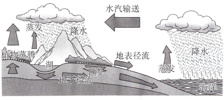 地球上的水通过蒸发、蒸腾、水汽输送、降水、地表径流、地下径流等环节实现循环。