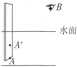 (1) 如图所示,来自池底$A$点的光,从水中斜射入空气时,在水面处发生______现象,岸上的人,当眼睛位于$B$处时,逆着射入眼睛的光看去,感觉$A点升高到A'$的位置,即池水看起来比实际的______。
