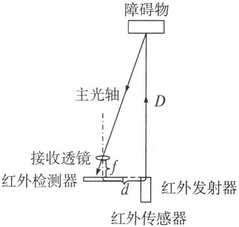 很多机器人为了“看见”周围的物体,需要有自己的“眼睛”,例如家庭中的扫地机器人,工作时就要能探知前方的家具、墙壁等障碍物。红外传感器就是一种机器人的“眼睛”,其工作原理如图所示,红外传感器上的红外发射器向前方发射一束红外线,碰到障碍物后向各个方向反射,其中一束红外线通过接收透镜中心,照射到红外检测器上的某一位置,该位置偏离透镜主光轴的距离称为偏移值。如果检测器到透镜的距离为f,红外发射器中心线与接收透镜主光轴之间的距离为d,当偏移值为l时,根据三角形的相似关系,可计算出红外传感器到障碍物的距离$D= \frac{f(l+d)}{l}$。