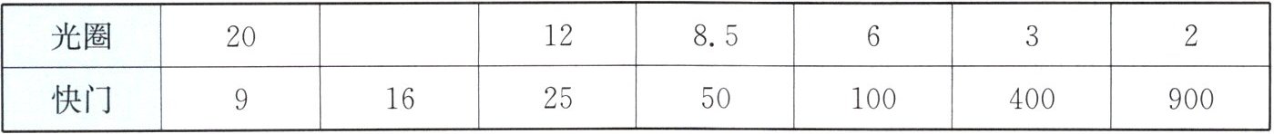 C 【解析】快门一行的数据由9变为16时,曝光时间之比$\frac{t_{1}}{t_{2}}=\frac{\frac{1}{9}}{\frac{1}{16}}=\frac{16}{9}$,则相应光圈的透光面积与原来透光面积之比$\frac{S_{1}}{S_{2}}=\frac{9}{16}$;由$S=\pi r^{2}$得$\frac{S_{1}}{S_{2}}=\frac{\pi\left( \frac{1}{2×20}\right)^{2}}{\pi\left( \frac{1}{2× x}\right)^{2}}=\frac{9}{16}$,解得$x=15$,即快门“16”对应的“光圈”为15。