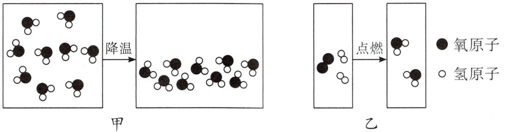 2. 如图所示,甲、乙分别是水蒸气液化、氢气在氧气中燃烧生成水的微观变化示意图。请回答下列问题。