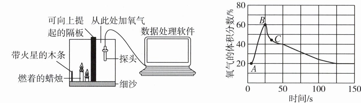 12. 某实验小组为探究氧气的性质,利用传感器绘制氧气的体积分数与时间的曲线图。曲线在AB段时,隔板未提起;曲线在BC段时,隔板稍微向上提起。通过该实验不能获取的信息是( )。
