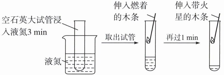 $\frac{1}{3}$的液态空气。取出试管,液态空气沸腾,伸入燃着的木条,木条熄灭;1min后伸入带火星的木条,观察到木条复燃。导致木条熄灭的原因是 。②上述实验利用氮气与氧气的沸点不同实现分离,由实验现象可知,两种气体中沸点比较高的气体是 。