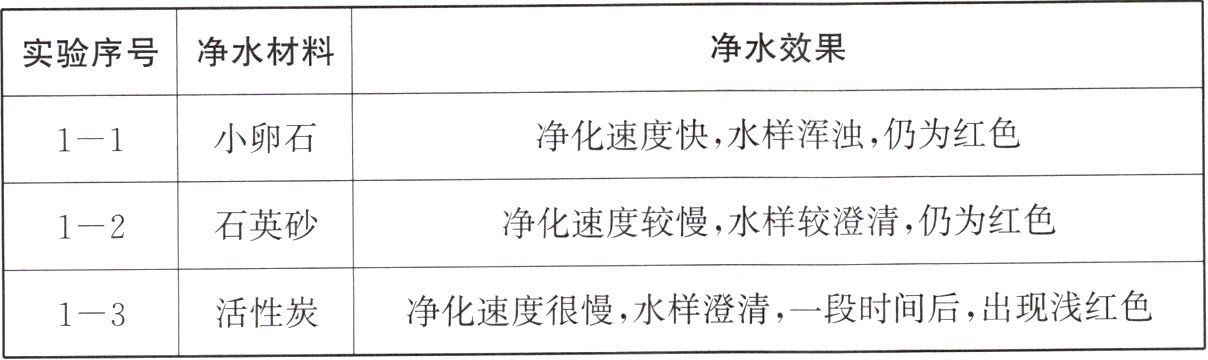 实验 1:分别用等量不同材料装填装置(见图),对 100 mL 河水(预先滴入 1 滴红墨水)进行净化。实验记录如下: