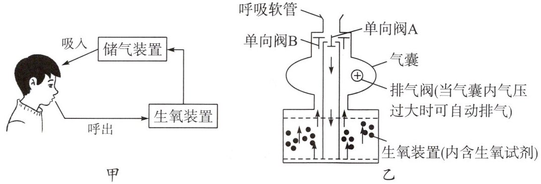 化学兴趣小组的同学设计了一款在缺氧环境或出现高浓度有毒有害气体环境下逃生时使用的自救呼吸器。其设计思路如图甲所示,自救呼吸器的结构如图乙所示(其中箭头方向表示气体流动方向)。下列说法不正确的是(