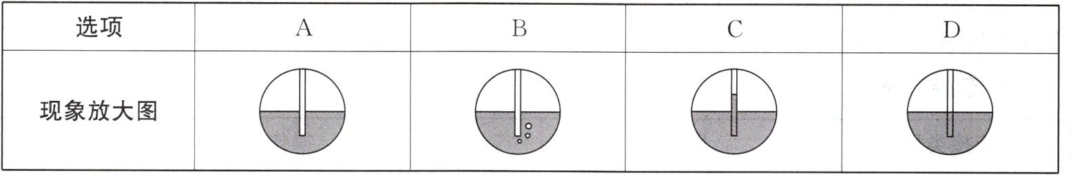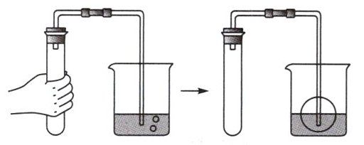 2. 如图所示,某同学采用手握试管外壁的方法检查装置的气密性,若装置的气密性良好,则将手移开一会儿后,烧杯内导管处的现象(画圈部分)是(