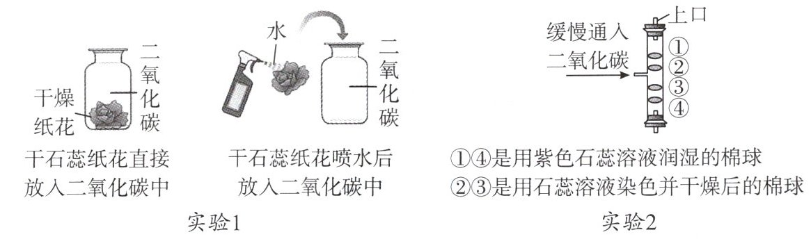 (1)石蕊纸花变成红色 ${H_{2}CO_{3}}$ ${CO_{2} + H_{2}O\xlongequal{}H_{2}CO_{3}}$