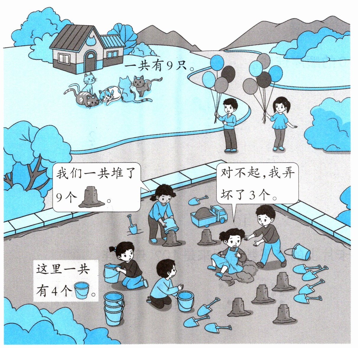 (1) 房子里有几只猫? $$ □ ◯ □ = □ (只) $(2) 还剩几个完好的? $$ □ ◯ □ = □ (个) $