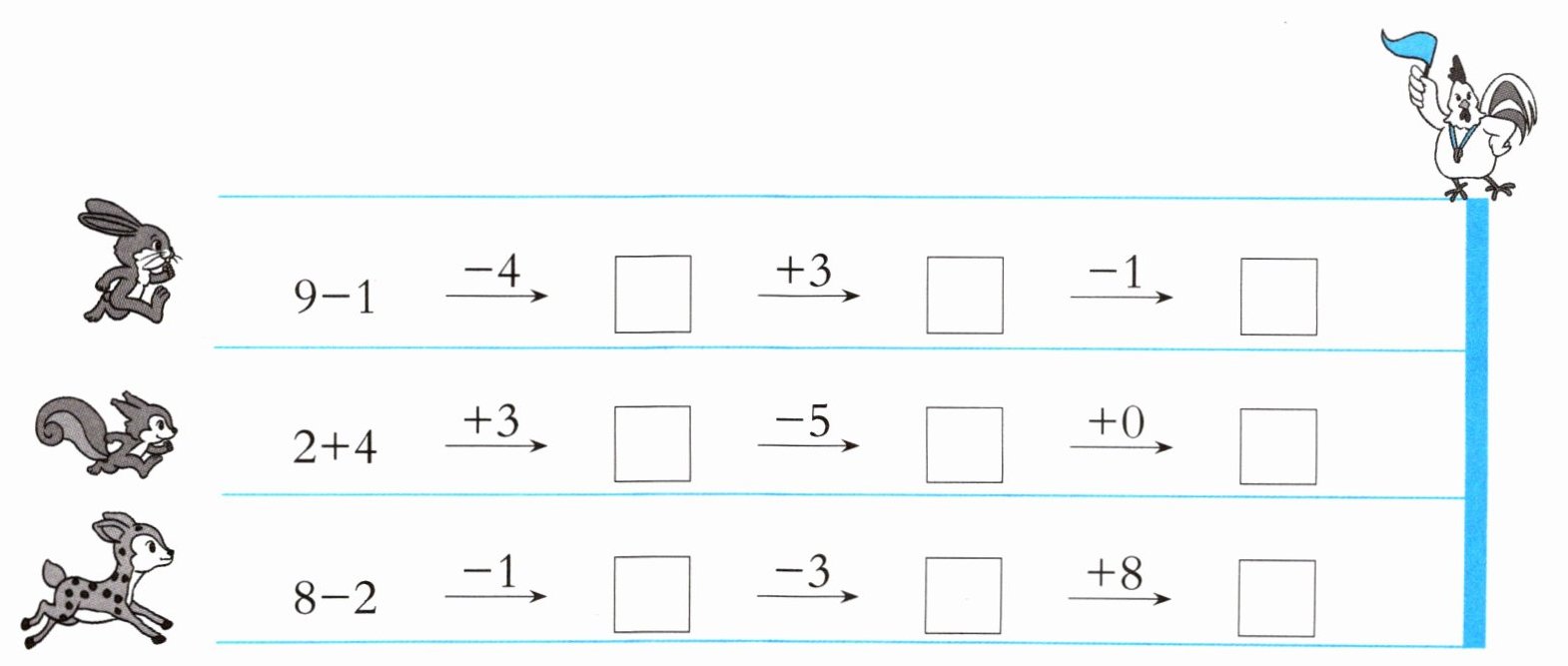 $9 - 1 \xrightarrow{-4} □ \xrightarrow{+3} □ \xrightarrow{-1} □$