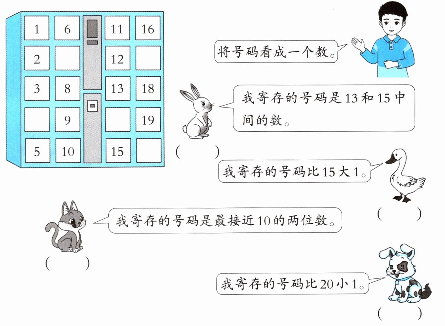 4. 先将寄存柜上的号码补充完整,再猜一猜小动物的号码。
